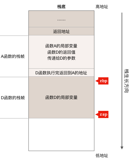 因为C、B两个函数都已经执行完成并返回到了A函数之中,所以C、B两个函数的栈帧就已经被POP出栈了,也就是说它们所消耗的栈内存被自动回收了。因为现在正在执行A函数,所以寄存器rbp和rsp指向的是A函数的栈中的相应位置。如果A函数又继续调用了D函数的话,则栈又变成下面这个样子: