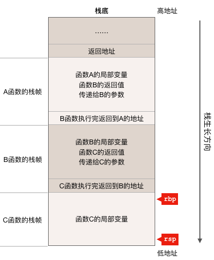 则函数ABC的栈帧以及rsp/rbp的状态大致如下图所示(注意,栈从高地址向低地址方向生长):